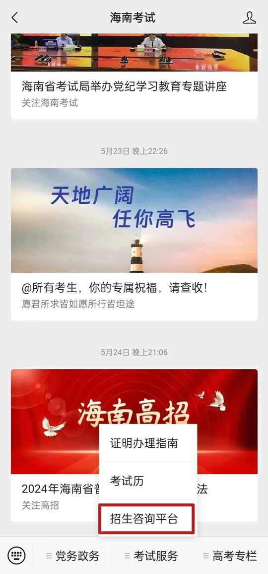 關(guān)注“海南考試”公眾號(hào),點(diǎn)擊菜單欄“考試服務(wù)”-“招生咨詢(xún)平臺(tái)”,即可進(jìn)入。