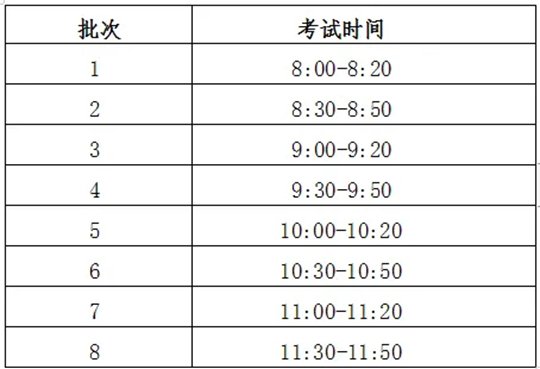 考試時(shí)間:6月28日上午,半天。上午8:00開(kāi)始,每批次時(shí)長(zhǎng)30分鐘(含批次間隔10分鐘),考生實(shí)際作答時(shí)間為20分鐘,考生應(yīng)在7點(diǎn)30分前到達(dá)考點(diǎn)。