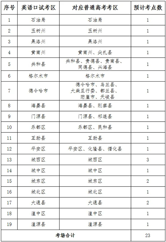 2024年英語(yǔ)口試全省共設(shè)19個(gè)考區(qū),考生只能在本人所屬普通高考考區(qū)對(duì)應(yīng)的英語(yǔ)口試考區(qū)參加考試,二者對(duì)應(yīng)關(guān)系為: