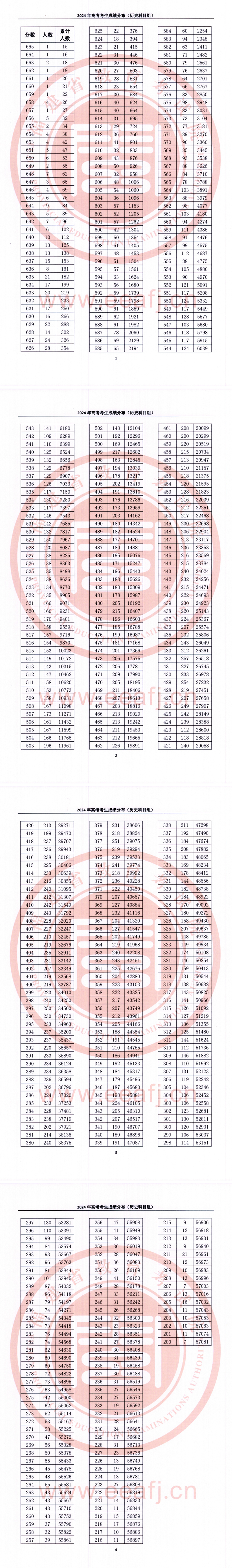 福建:2024年高考考生成績分布(歷史科目組)