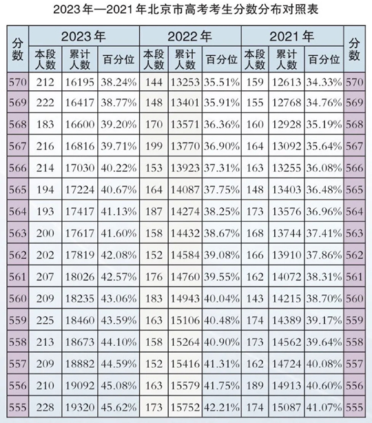 具體方法:一是查詢本人的“總分”在“2024年北京市高考考生分?jǐn)?shù)分布”中所處位置的累計(jì)人數(shù)(即個(gè)人在整體中的排名),記錄個(gè)人分?jǐn)?shù)位次及同分的本段人數(shù);二是按選考科目群體查詢本人成績排名,記錄下不同選考科目組合群體中高于本人成績的人數(shù);三是計(jì)算總分所處的相對位置(百分比位置)。計(jì)算方法:排名/控制線所處累計(jì)人數(shù)。以2023年數(shù)據(jù)為例說明如下。