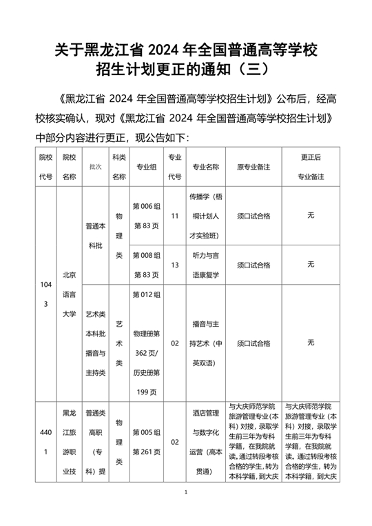 關(guān)于黑龍江省2024年全國(guó)普通高等學(xué)校招生計(jì)劃更正的通知(三)