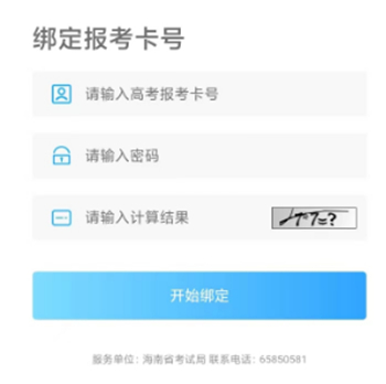 第五步:若當(dāng)前海易辦賬號(hào)沒有綁定高考報(bào)考卡號(hào),則系統(tǒng)將跳轉(zhuǎn)到綁定報(bào)考卡號(hào)頁面。輸入報(bào)考卡號(hào)、密碼和驗(yàn)證碼進(jìn)行綁定后即可登錄。