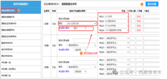 。╤ttp://zsks.edu.xizang.gov.cn/)或“西藏微青年”微信公眾號下載查閱《西藏自治區(qū)2024年普通高等學校招生計劃》,登錄有關高校官網(wǎng)查詢、了解招生政策、招生章程和有關規(guī)定,根據(jù)報考科類、院校專業(yè)組、成績排名、招生計劃、招生政策等情況,并結合自身體檢結果等,確定每個要報考批次的院校和專業(yè)(建議準備自制的擬填報志愿草表)。我區(qū)實行所有批次全部一次性填報志愿,填報結果作為考生投檔錄取的依據(jù)。