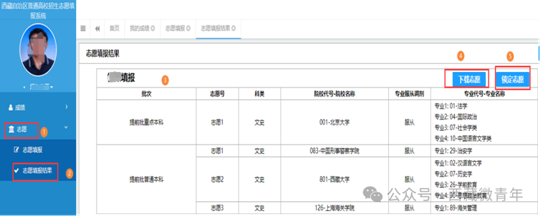 保存的所填志愿可在左側列表依次點擊“志愿”、“志愿填報結果”查看。核對無誤且不再修改,須下載志愿表,并鎖定志愿。志愿一經鎖定,任何人不得修改。如確系填報有誤需解鎖,考生本人攜準考證、身份證到報名地(市)或戶籍所在地(市)教育招生考試機構,提交解鎖申請。志愿填報期間最多允許兩次解鎖。