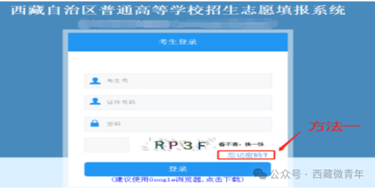建議考生在計算機瀏覽器或Chrome(谷歌)瀏覽器地址欄輸入網(wǎng)址(http://ptgx.zsks.edu.xizang.gov.cn:8084)后回車,進入“西藏自治區(qū)普通高等學校招生志愿填報系統(tǒng)”考生登錄界面。