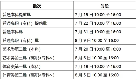 征集志愿必須由考生本人到當(dāng)?shù)卣猩荚嚈C(jī)構(gòu)指定的具備視頻監(jiān)控和網(wǎng)上巡查條件的學(xué)校機(jī)房上網(wǎng)填報(bào)。各批次具體填報(bào)時(shí)間見下表: