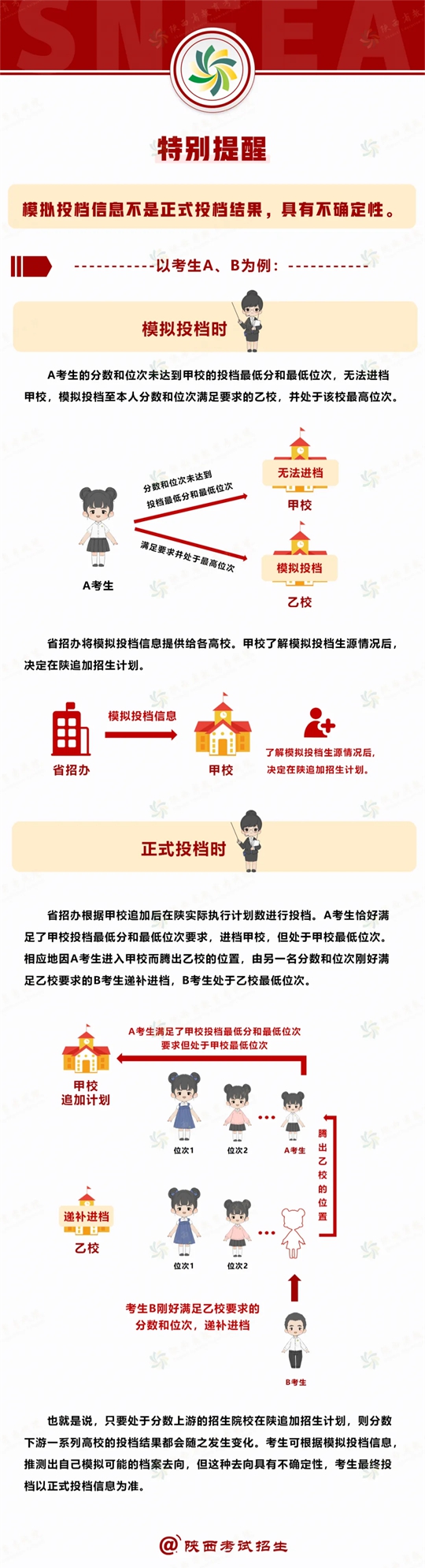 平行志愿是基于分?jǐn)?shù)優(yōu)先理念的一種錄取模式。為確保正式投檔的絕大多數(shù)考生都能夠被錄取,正式投檔前先進(jìn)行模擬投檔,目的是為在陜招生高校了解我省生源情況提供信息。