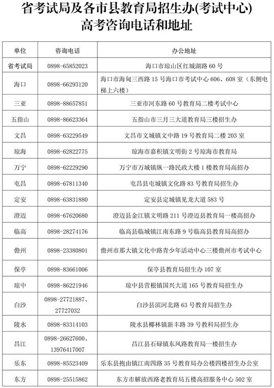 海南省考試局及各市縣教育局招生辦(考試中心)高考咨詢電話和地址