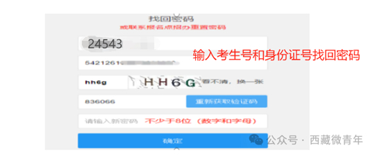 第四步,在找回密碼界面,輸入短信驗證碼和新設(shè)置的密碼(不少于8位的數(shù)字和字母組合),核對無誤后,點擊“確定”“確認(rèn)密碼修改”,完成密碼修改。使用新設(shè)置密碼重新登錄“西藏自治區(qū)普通高等學(xué)校招生志愿填報系統(tǒng)”。