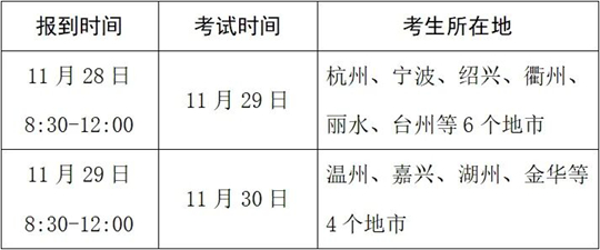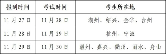本次考試時(shí)間為11月28日—30日,按地區(qū)分三批在金華職業(yè)技術(shù)大學(xué)進(jìn)行?忌氂诳荚嚽耙惶,持本人身份證到組考學(xué)校辦理報(bào)到手續(xù),填寫考點(diǎn)規(guī)定的表格,領(lǐng)取準(zhǔn)考證,了解考試安排情況。報(bào)到地點(diǎn)見金華職業(yè)技術(shù)大學(xué)招生網(wǎng)(https://zsw.jhc.edu.cn)通知。具體時(shí)間安排如下: