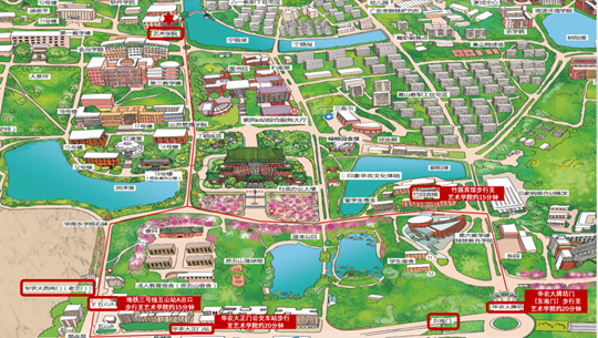 在華農(nóng)大正門車站下車,步行至華南農(nóng)業(yè)大學(xué)藝術(shù)學(xué)院(步行約需20分鐘)