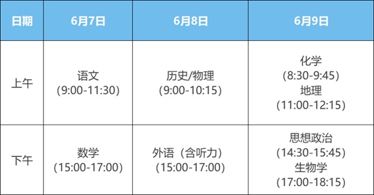 特別提醒:考生可在考前40分鐘(語(yǔ)文科目為考前45分鐘)于考場(chǎng)前門(mén)入口處排隊(duì)等候,依次進(jìn)入考場(chǎng)。各科目開(kāi)考15分鐘后(外語(yǔ)科目14時(shí)45分后)考生不得進(jìn)入考點(diǎn)參加當(dāng)次科目考試。語(yǔ)文、數(shù)學(xué)、外語(yǔ)3門(mén)科目交卷出場(chǎng)時(shí)間均不得早于考試結(jié)束前30分鐘,交卷出場(chǎng)后不得再進(jìn)場(chǎng)續(xù)考,也不得在考場(chǎng)附近逗留或交談;物理、歷史、化學(xué)、地理、思想政治、生物學(xué)6門(mén)科目不得提前交卷。
