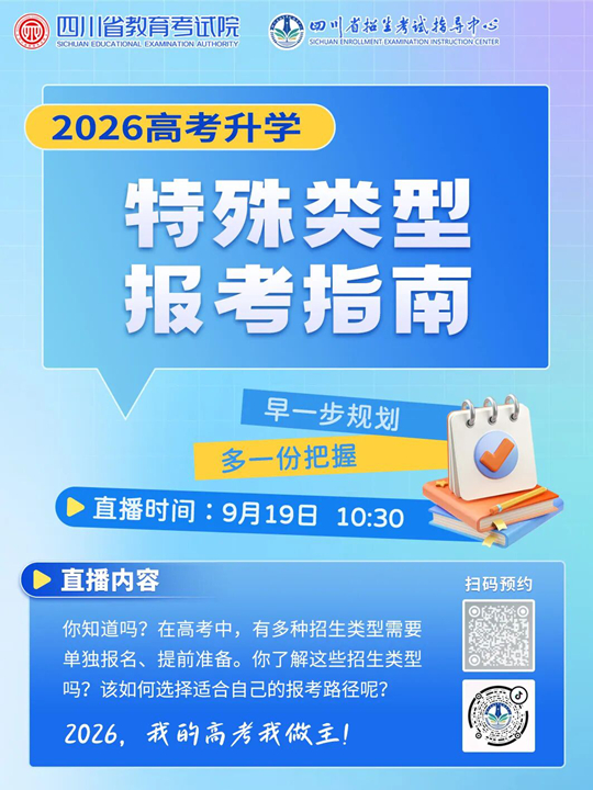 高考,承載著“為黨育人、為國(guó)選才”的重要使命,廣受社會(huì)關(guān)注。目前,空軍招飛、海軍招飛、部分綜合評(píng)價(jià)招生高校已發(fā)布2026年招生政策,為助力我省廣大考生、家長(zhǎng)把握高考政策動(dòng)態(tài)、規(guī)劃升學(xué)路徑,由四川省教育考試院指導(dǎo)、四川省招生考試指導(dǎo)中心傾力推出的“2026年高考升學(xué)特殊類型報(bào)考指南”直播活動(dòng)將于本周五開(kāi)播。