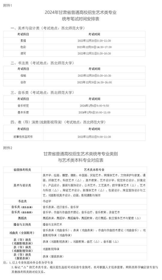 1.2024年甘肅省普通高校招生藝術類專業(yè)統(tǒng)考筆試時間安排表