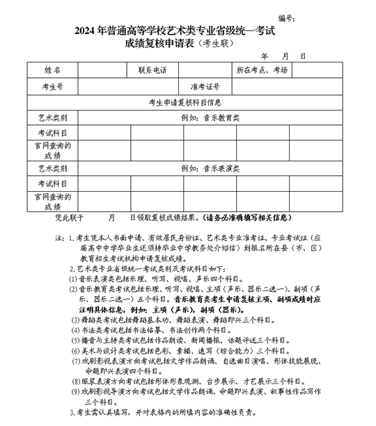 附件:1.2024年普通高等學(xué)校藝術(shù)類專業(yè)省級統(tǒng)一考試成績復(fù)核申請表
