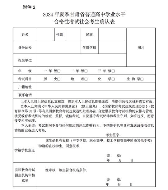 2.2024年夏季甘肅省普通高中學(xué)業(yè)水平合格性考試社會考生確認(rèn)表