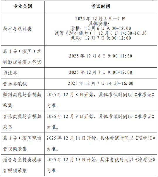 (2)藝術(shù)類專業(yè)省級(jí)統(tǒng)考筆試科目安排在2025年12月6日至7日進(jìn)行,現(xiàn)場(chǎng)音視頻采集科目于2025年12月8日開(kāi)始。具體安排如下表: