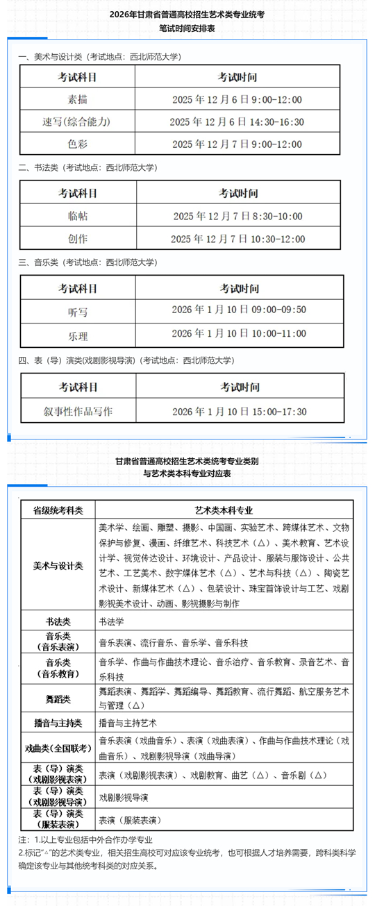 1.2026年甘肅省普通高校招生藝術(shù)類專業(yè)統(tǒng)考筆試時(shí)間安排表
