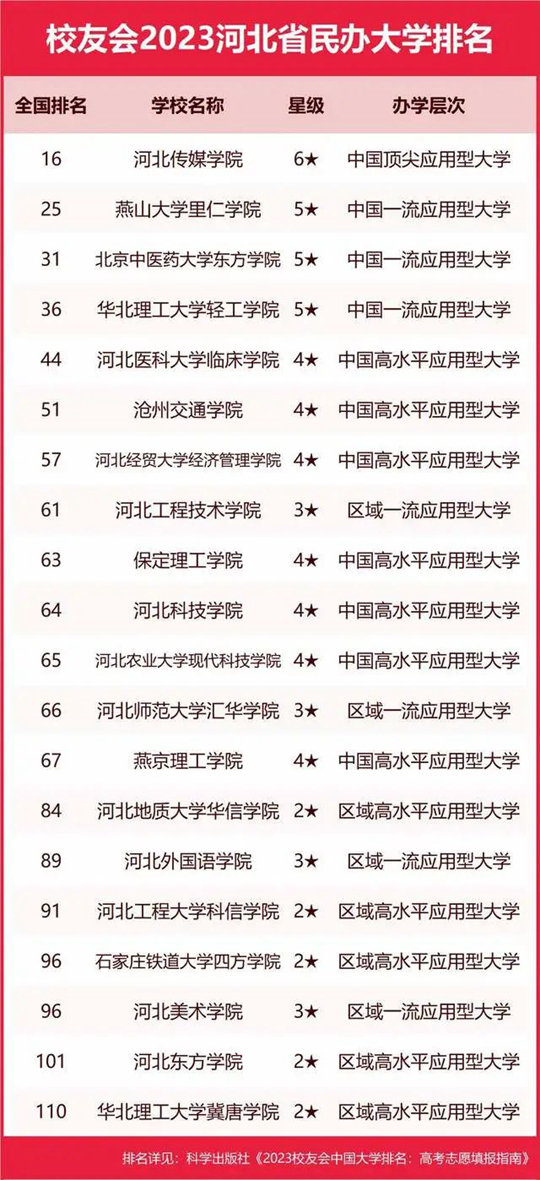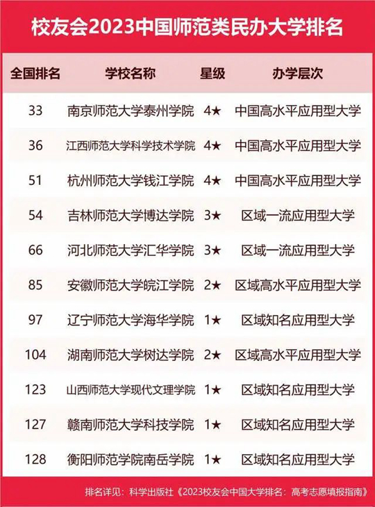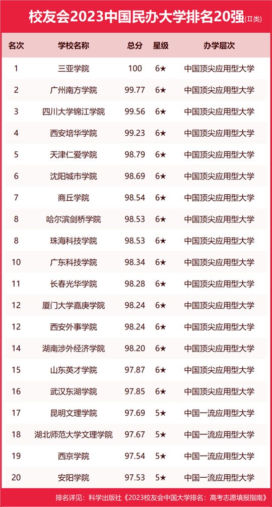 三亞學(xué)院、廣州南方學(xué)院、四川大學(xué)錦江學(xué)院、西安培華學(xué)院、天津仁愛學(xué)院、沈陽(yáng)城市學(xué)院、商丘學(xué)院、哈爾濱劍橋?qū)W院、珠?萍紝W(xué)院、廣東科技學(xué)院雄居校友會(huì)2023中國(guó)民辦大學(xué)排名Ⅱ類前10強(qiáng)。