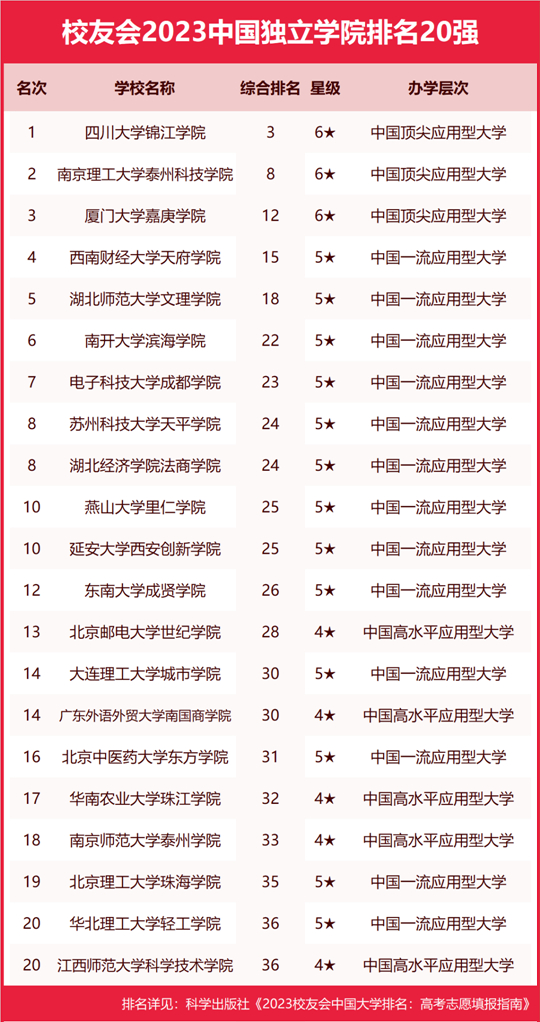 四川大學(xué)錦江學(xué)院、南京理工大學(xué)泰州科技學(xué)院、廈門大學(xué)嘉庚學(xué)院、西南財(cái)經(jīng)大學(xué)天府學(xué)院、湖北師范大學(xué)文理學(xué)院、南開大學(xué)濱海學(xué)院、電子科技大學(xué)成都學(xué)院、蘇州科技大學(xué)天平學(xué)院、湖北經(jīng)濟(jì)學(xué)院法商學(xué)院、燕山大學(xué)里仁學(xué)院、延安大學(xué)西安創(chuàng)新學(xué)院雄居校友會(huì)2023中國(guó)獨(dú)立學(xué)院排名前10強(qiáng)。