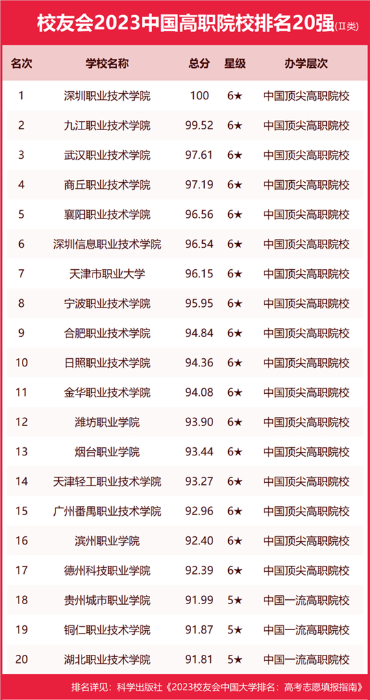 深圳職業(yè)技術(shù)學(xué)院、九江職業(yè)技術(shù)學(xué)院、武漢職業(yè)技術(shù)學(xué)院、商丘職業(yè)技術(shù)學(xué)院、襄陽(yáng)職業(yè)技術(shù)學(xué)院、深圳信息職業(yè)技術(shù)學(xué)院、天津市職業(yè)大學(xué)、寧波職業(yè)技術(shù)學(xué)院、合肥職業(yè)技術(shù)學(xué)院、日照職業(yè)技術(shù)學(xué)院位列校友會(huì)2023中國(guó)高職院校排名Ⅱ類前10強(qiáng)。