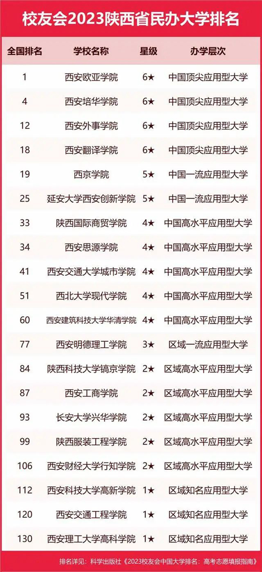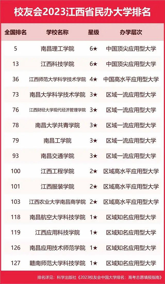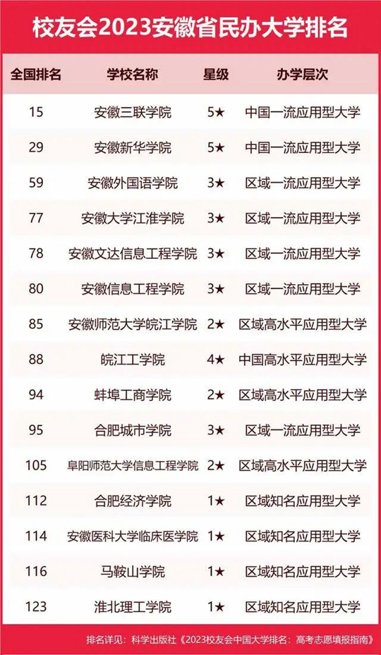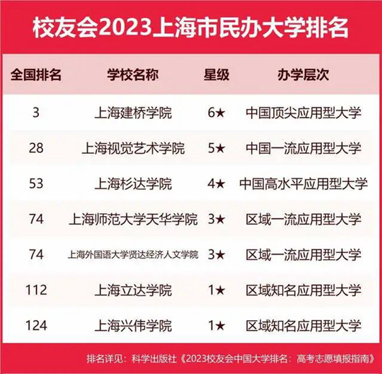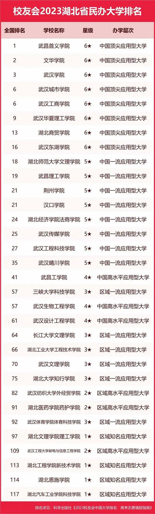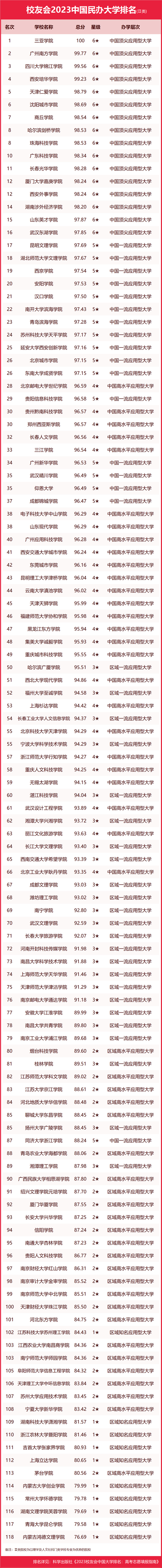 武昌首義學(xué)院、文華學(xué)院、上海建橋?qū)W院位居2023中國(guó)民辦大學(xué)排名I類前3強(qiáng)。三亞學(xué)院、廣州南方學(xué)院、四川大學(xué)錦江學(xué)院位列2023中國(guó)民辦大學(xué)排名Ⅱ類前3強(qiáng)。西安歐亞學(xué)院、昆明城市學(xué)院、武漢學(xué)院位列2023中國(guó)民辦大學(xué)排名Ⅲ類前3名。