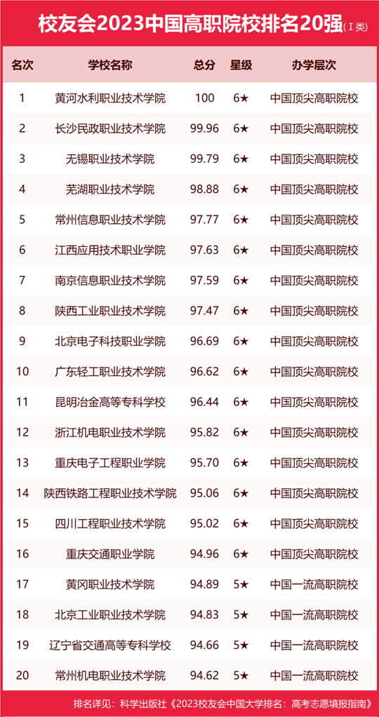 黃河水利職業(yè)技術學院高居2023中國高職院校排名I類第1,無錫職業(yè)技術學院第3