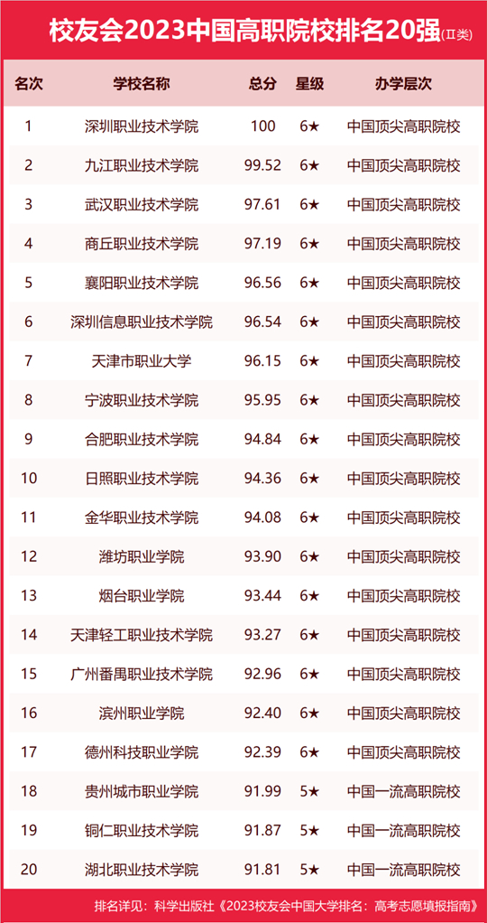 深圳職業(yè)技術學院、九江職業(yè)技術學院、武漢職業(yè)技術學院、商丘職業(yè)技術學院、襄陽職業(yè)技術學院、深圳信息職業(yè)技術學院、天津市職業(yè)大學、寧波職業(yè)技術學院、合肥職業(yè)技術學院、日照職業(yè)技術學院位列校友會2023中國高職院校排名Ⅱ類10強。