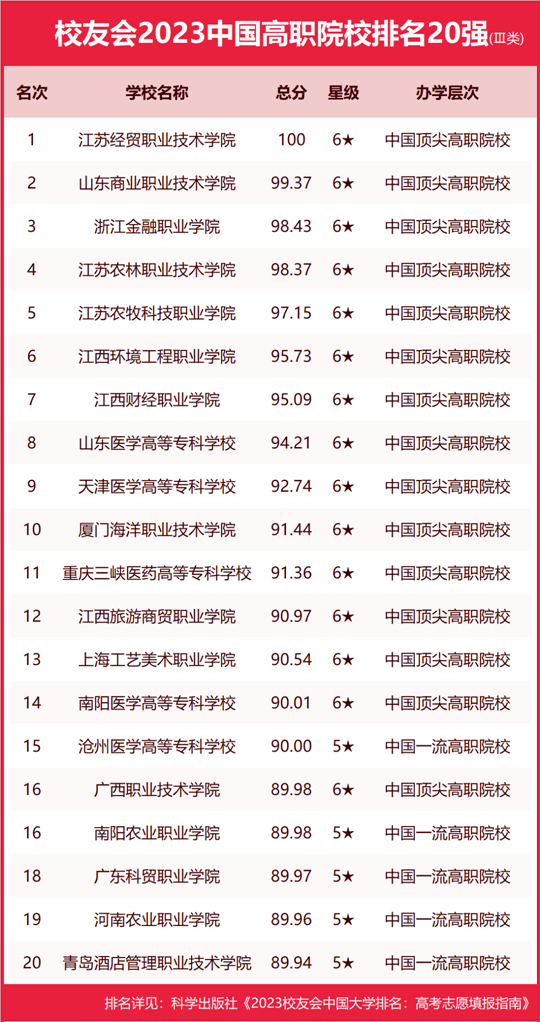 江蘇經貿職業(yè)技術學院、山東商業(yè)職業(yè)技術學院、浙江金融職業(yè)學院、江蘇農林職業(yè)技術學院、江蘇農牧科技職業(yè)學院、江西環(huán)境工程職業(yè)學院、江西財經職業(yè)學院、山東醫(yī)學高等?茖W校、天津醫(yī)學高等?茖W校、廈門海洋職業(yè)技術學院名列校友會2023中國高職院校排名Ⅲ類10強。