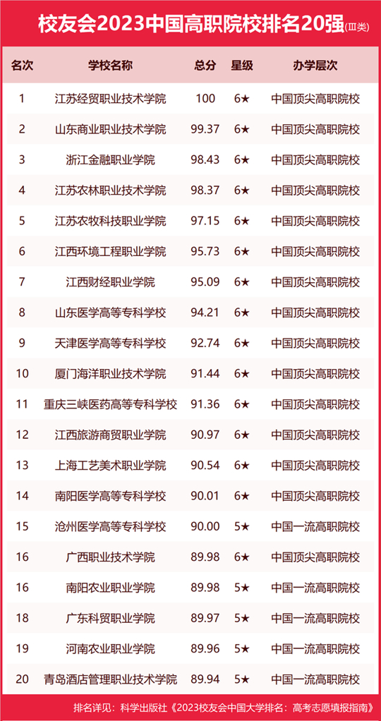 江蘇經(jīng)貿(mào)職業(yè)技術(shù)學(xué)院、山東商業(yè)職業(yè)技術(shù)學(xué)院、浙江金融職業(yè)學(xué)院、江蘇農(nóng)林職業(yè)技術(shù)學(xué)院、江蘇農(nóng)牧科技職業(yè)學(xué)院名列2023中國(guó)高職院校排名Ⅲ類前5名。