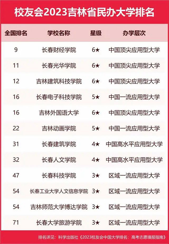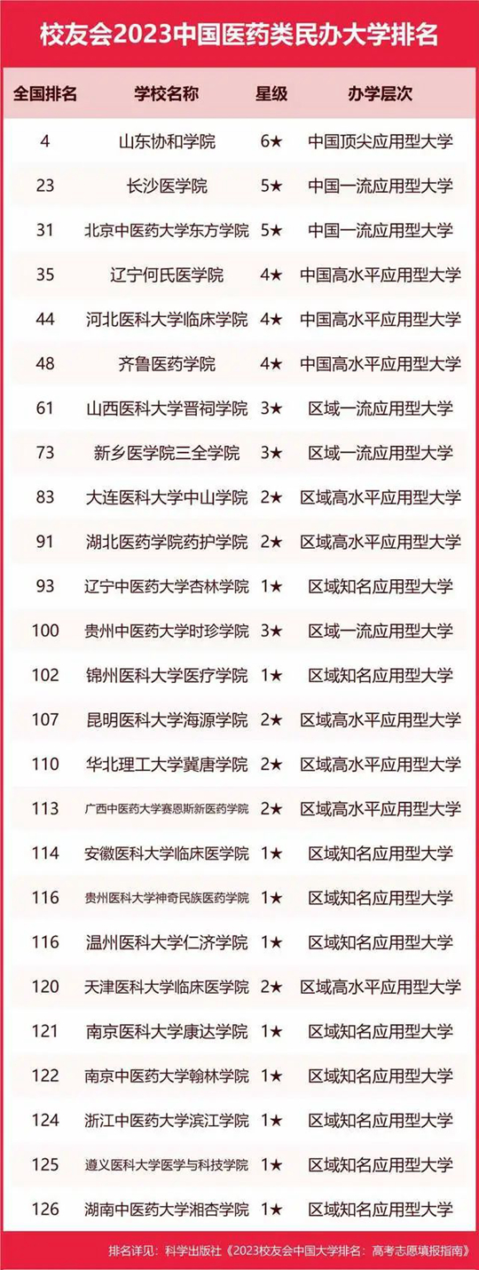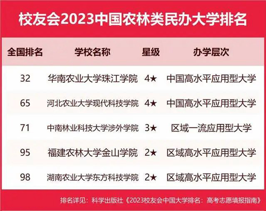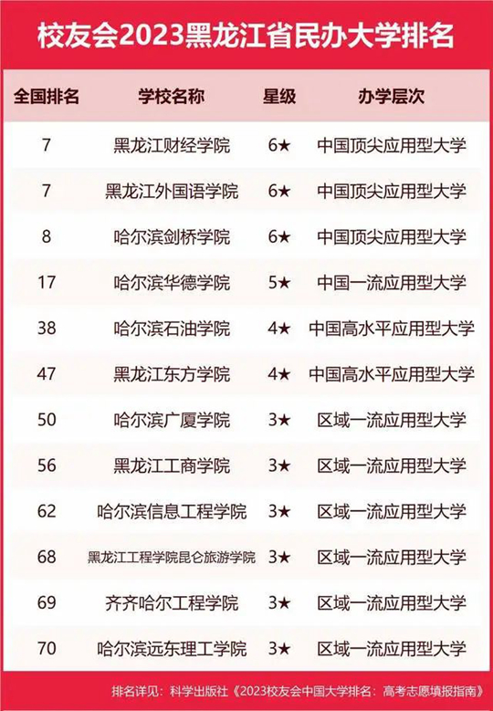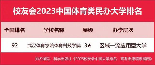 武昌首義學(xué)院、三亞學(xué)院、西安歐亞學(xué)院、山東協(xié)和學(xué)院、黑龍江外國(guó)語學(xué)院、青島電影學(xué)院、華南農(nóng)業(yè)大學(xué)珠江學(xué)院、南京師范大學(xué)泰州學(xué)院、武漢體育學(xué)院體育科技學(xué)院分列校友會(huì)2023中國(guó)理工類、綜合類、財(cái)經(jīng)類、醫(yī)藥類、語言類、藝術(shù)類、農(nóng)林類、師范類和體育類民辦大學(xué)排名第一。