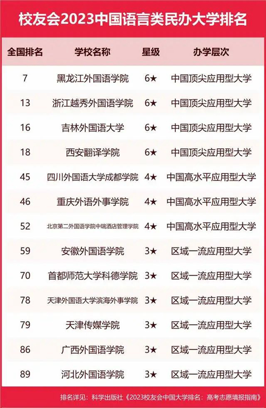 西安歐亞學(xué)院、昆明城市學(xué)院、武漢學(xué)院、福州外語外貿(mào)學(xué)院、山東協(xié)和學(xué)院位列2023中國(guó)民辦大學(xué)排名Ⅲ類前5名。