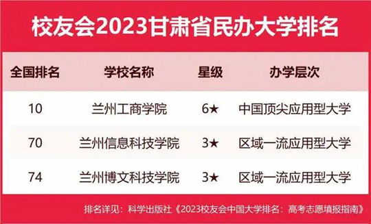 寧波諾丁漢大學(xué)、北京師范大學(xué)-香港浸會(huì)大學(xué)聯(lián)合國(guó)際學(xué)院、西交利物浦大學(xué)位列2023中國(guó)合作辦學(xué)大學(xué)排名前3強(qiáng)。海南科技職業(yè)大學(xué)、廣東工商職業(yè)技術(shù)大學(xué)、蘭州資源環(huán)境職業(yè)技術(shù)大學(xué)位居2023中國(guó)職業(yè)技術(shù)大學(xué)排名前3甲。