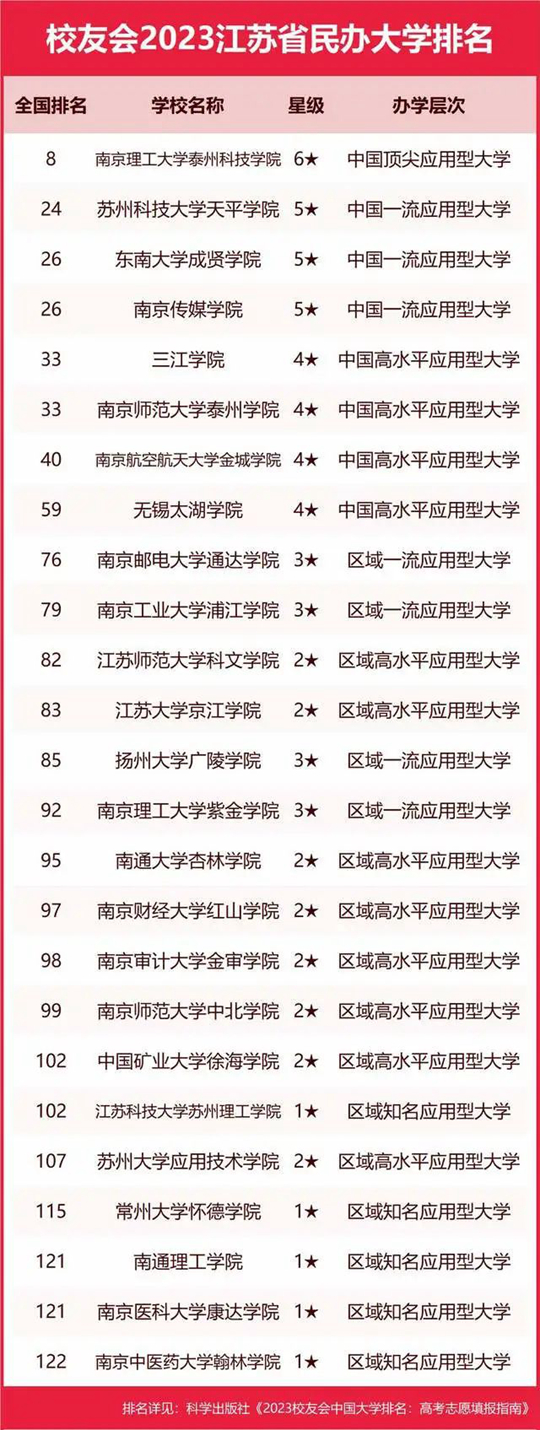 四川大學(xué)錦江學(xué)院、南京理工大學(xué)泰州科技學(xué)院、廈門大學(xué)嘉庚學(xué)院、西南財(cái)經(jīng)大學(xué)天府學(xué)院、湖北師范大學(xué)文理學(xué)院名列校友會(huì)2023中國(guó)獨(dú)立學(xué)院排名前5強(qiáng)。