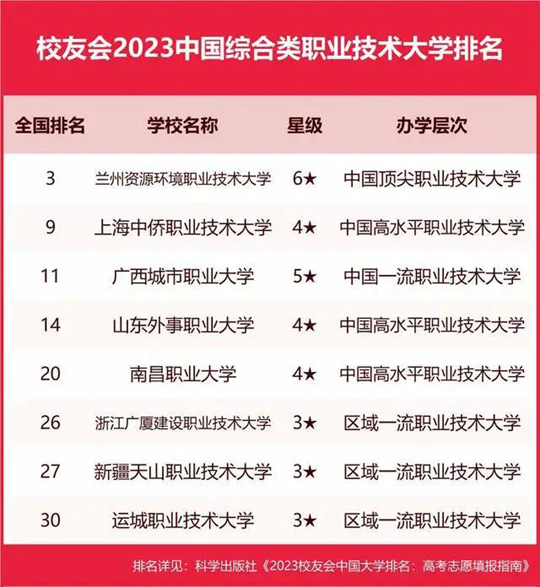 在最新校友會(huì)2023中國(guó)職業(yè)技術(shù)大學(xué)排名中,蘭州資源環(huán)境職業(yè)技術(shù)大學(xué)綜合排名最高、辦學(xué)水平最高,全國(guó)排名第3名,位列校友會(huì)2023中國(guó)綜合類職業(yè)技術(shù)大學(xué)排名冠軍。上海中僑職業(yè)技術(shù)大學(xué)高居全國(guó)第9名,名列第2名。廣西城市職業(yè)大學(xué)名列全國(guó)第11名,高居第3名。