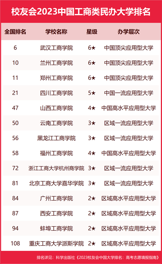 在最新校友會2023中國民辦大學(xué)排名中,武漢工商學(xué)院辦學(xué)實(shí)力最強(qiáng)、最具競爭力、辦學(xué)水平最高,全國排名第6名,穩(wěn)居校友會2023中國工商類民辦大學(xué)排名榜首。蘭州工商學(xué)院高居全國第10名,位居第2名。鄭州工商學(xué)院排行全國第11名,排名第3名。四川工商學(xué)院位列全國第21名,排行第4名。山西工商學(xué)院位列全國第47名,排行第5名。