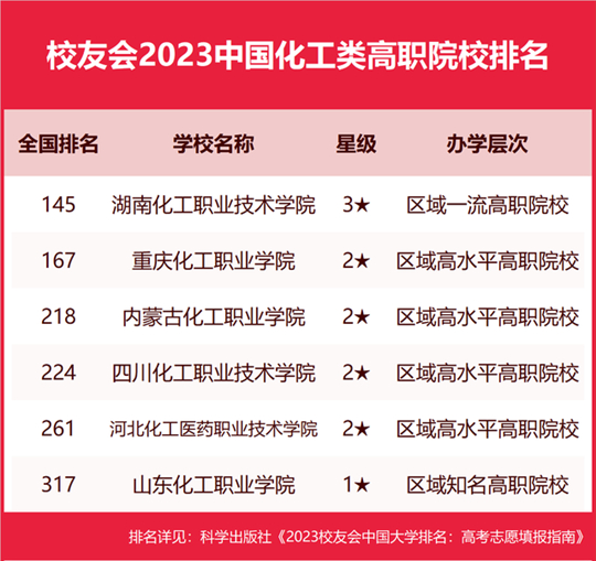在最新校友會2023中國高職院校排名中,湖南化工職業(yè)技術(shù)學(xué)院綜合實力排名最高、辦學(xué)水平最高,全國排名第145名,高居校友會2023中國化工類高職院校排名首位。重慶化工職業(yè)學(xué)院排名全國第167名,排名第2名。內(nèi)蒙古化工職業(yè)學(xué)院位列全國第218名,排名第3名。