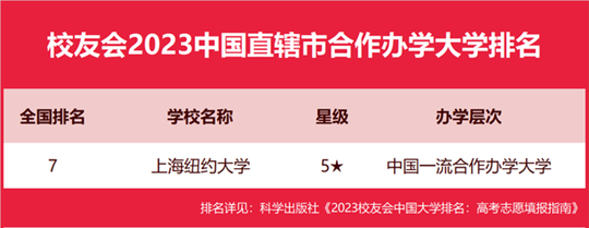 在最新校友會(huì)2023中國合作辦學(xué)大學(xué)排名中,上海紐約大學(xué)綜合實(shí)力排名最高、辦學(xué)水平最高,全國排名第7名,位列校友會(huì)2023中國直轄市合作辦學(xué)大學(xué)排名第一。