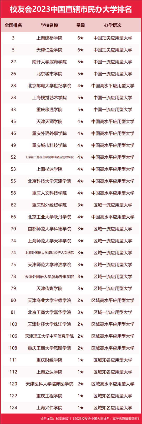 在最新校友會(huì)2023中國民辦大學(xué)排名中,上海建橋?qū)W院辦學(xué)實(shí)力最強(qiáng)、最具競(jìng)爭(zhēng)力、辦學(xué)水平最高,全國排名第3名,位列校友會(huì)2023中國直轄市民辦大學(xué)排名首位。天津仁愛學(xué)院位居全國第5名,排名第2名。南開大學(xué)濱海學(xué)院排名全國第22名,排名第3名。北京城市學(xué)院位列全國第26名,位居第4名。上海視覺藝術(shù)學(xué)院、北京郵電大學(xué)世紀(jì)學(xué)院位列全國第28名,位居第5名。