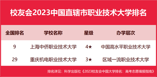 上海中僑職業(yè)技術(shù)大學(xué)勇奪2023中國直轄市職業(yè)技術(shù)大學(xué)排名首位,重慶機(jī)電職業(yè)技術(shù)大學(xué)第二