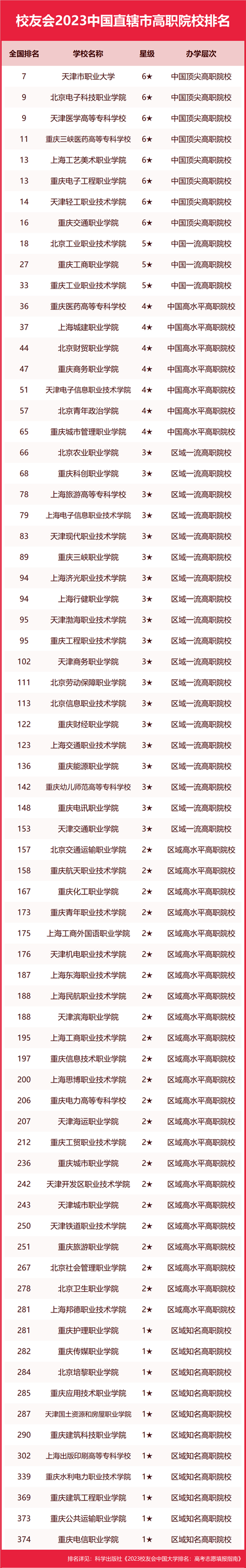 在最新校友會(huì)2023中國高職院校排名中,津市職業(yè)大學(xué)最具綜合競(jìng)爭(zhēng)力,全國排名第7名,奪得校友會(huì)2023中國直轄市高職院校排名第一。北京電子科技職業(yè)學(xué)院、天津醫(yī)學(xué)高等?茖W(xué)校名列全國第9名,位居第2名。重慶三峽醫(yī)藥高等?茖W(xué)校位居全國第11名,排行第4名。上海工藝美術(shù)職業(yè)學(xué)院、重慶電子工程職業(yè)學(xué)院名列全國第13名,排名第5名。