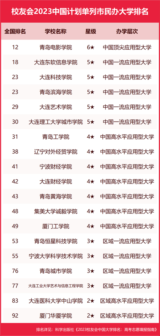 青島電影學(xué)院奪得2023中國計劃單列市民辦大學(xué)排名第一,大連東軟信息學(xué)院第二