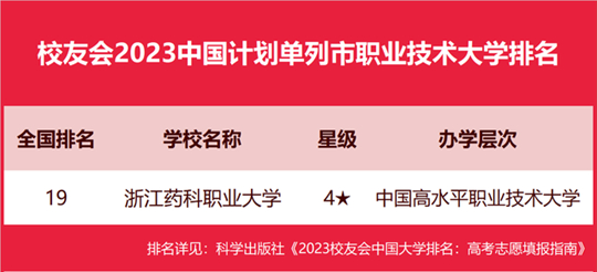 在最新校友會2023中國職業(yè)技術(shù)大學(xué)排名中,浙江藥科職業(yè)大學(xué)實力最強、水平最高、最具競爭力,全國排名第19名,高居校友會2023中國計劃單列市職業(yè)技術(shù)大學(xué)排名首位。