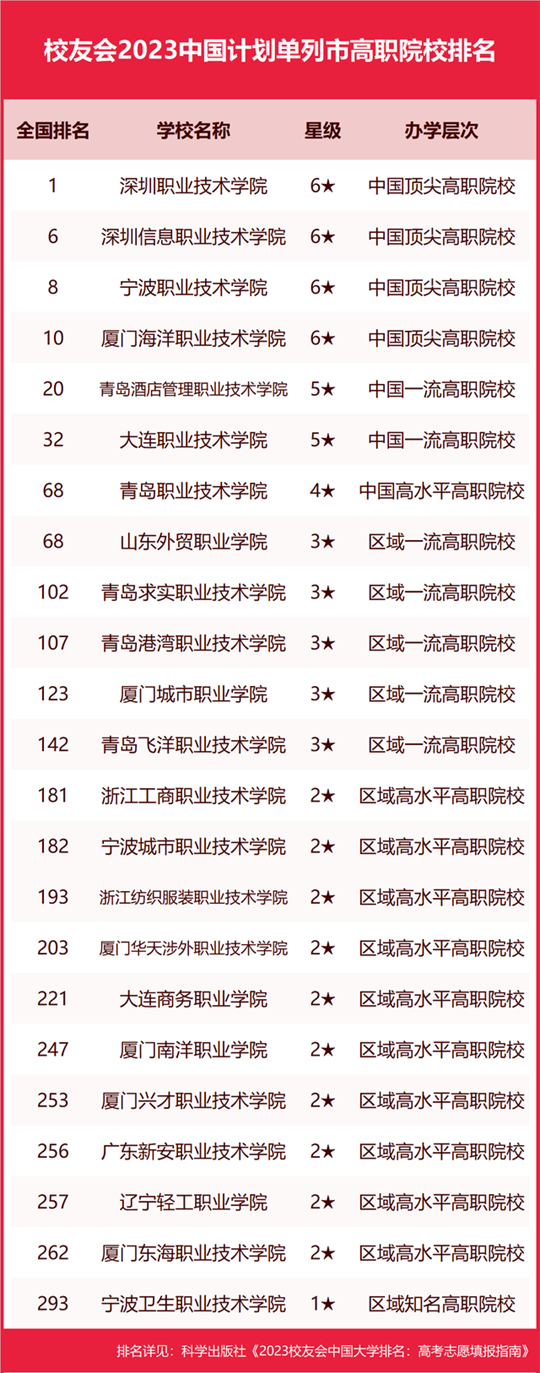 在最新校友會2023中國高職院校排名中,深圳職業(yè)技術(shù)學(xué)院最具綜合競爭力,全國排名第1名,名列校友會2023中國計劃單列市高職院校排名榜首。深圳信息職業(yè)技術(shù)學(xué)院位居全國第6名,高居第2名。寧波職業(yè)技術(shù)學(xué)院高居全國第8名,位列第3名。廈門海洋職業(yè)技術(shù)學(xué)院高居全國第10名,名列第4名。青島酒店管理職業(yè)技術(shù)學(xué)院名列全國第20名,排名第5名。