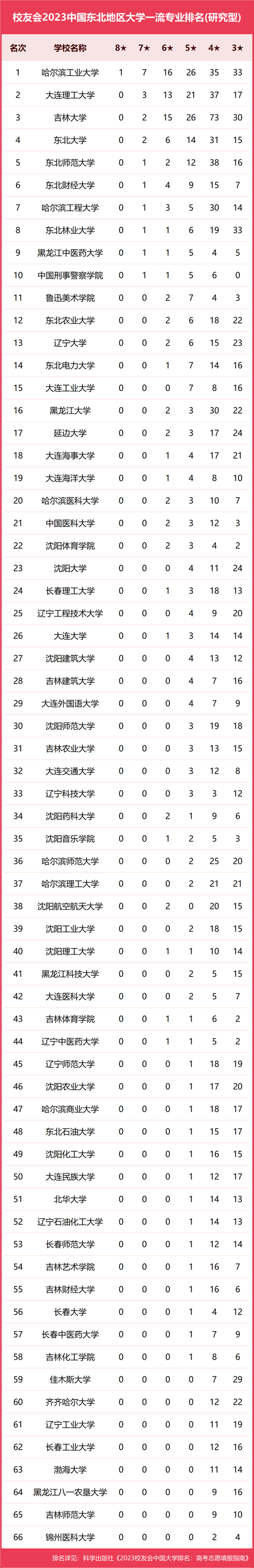榜單顯示,在最新校友會2023中國大學(xué)一流專業(yè)排名(研究型)中,哈爾濱工業(yè)大學(xué)、大連理工大學(xué)、吉林大學(xué)、東北大學(xué)、東北師范大學(xué)雄居校友會2023中國東北地區(qū)大學(xué)專業(yè)排名(研究型)前5強。北京大學(xué)、清華大學(xué)、中國人民大學(xué)、北京師范大學(xué)、南開大學(xué)雄居校友會2023中國華北地區(qū)大學(xué)專業(yè)排名(研究型)前5強。