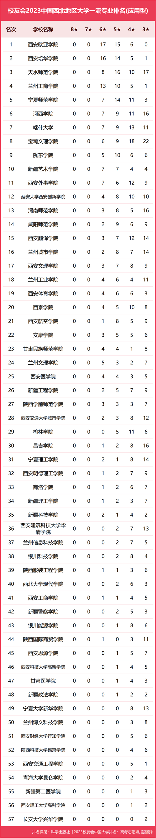 西安歐亞學(xué)院、西安培華學(xué)院、天水師范學(xué)院、蘭州工商學(xué)院、寧夏師范學(xué)院雄居校友會2023中國西北地區(qū)大學(xué)專業(yè)排名(應(yīng)用型)前5強。