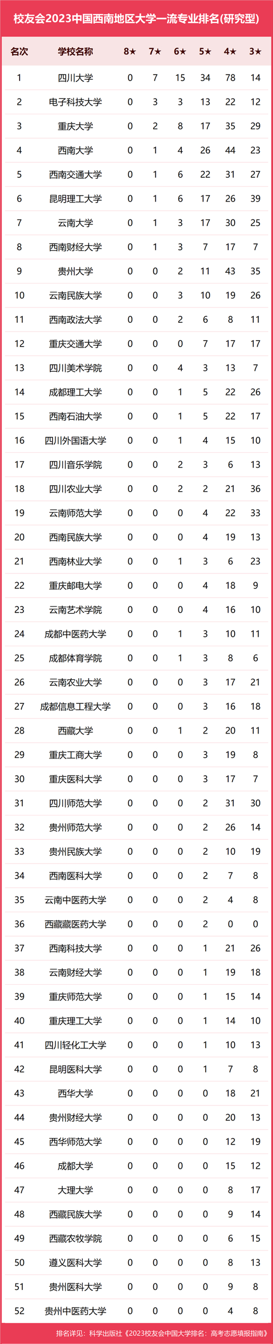 中山大學(xué)、華南理工大學(xué)、深圳大學(xué)、華南師范大學(xué)、暨南大學(xué)雄居校友會2023中國華南地區(qū)大學(xué)專業(yè)排名(研究型)前5強。四川大學(xué)、電子科技大學(xué)、重慶大學(xué)、西南大學(xué)、西南交通大學(xué)雄居校友會2023中國西南地區(qū)大學(xué)專業(yè)排名(研究型)前5強。