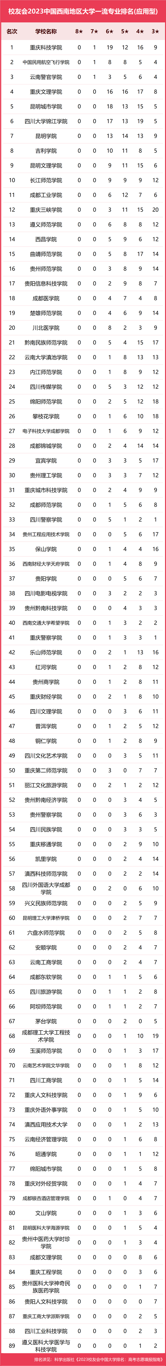廣西財經(jīng)學(xué)院、廣東金融學(xué)院、三亞學(xué)院、廣州南方學(xué)院、嶺南師范學(xué)院雄居校友會2023中國華南地區(qū)大學(xué)專業(yè)排名(應(yīng)用型)前5強。重慶科技學(xué)院、中國民用航空飛行學(xué)院、云南警官學(xué)院、重慶文理學(xué)院、昆明城市學(xué)院雄居校友會2023中國西南地區(qū)大學(xué)專業(yè)排名(應(yīng)用型)前5強。