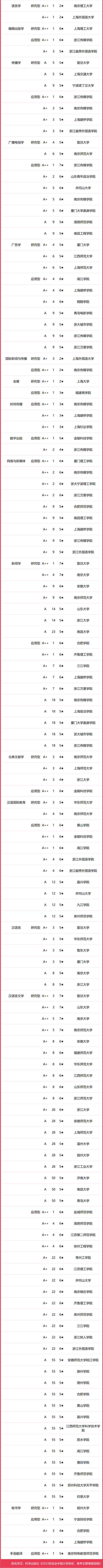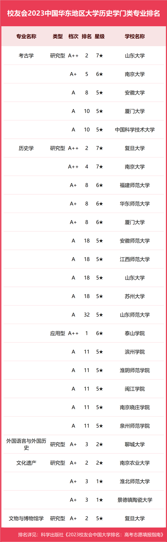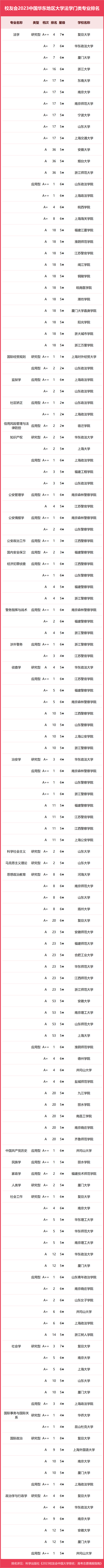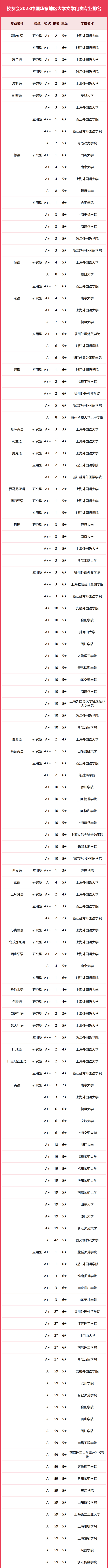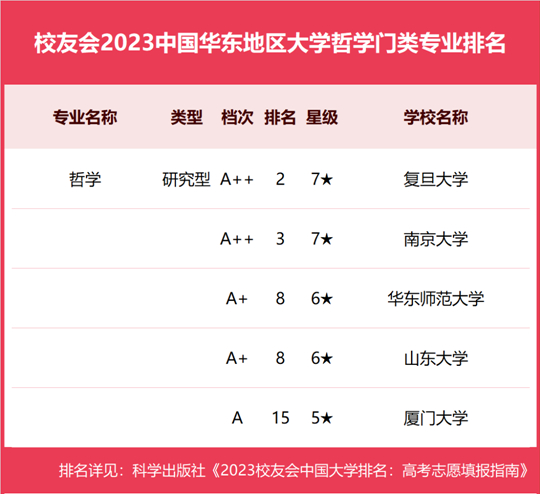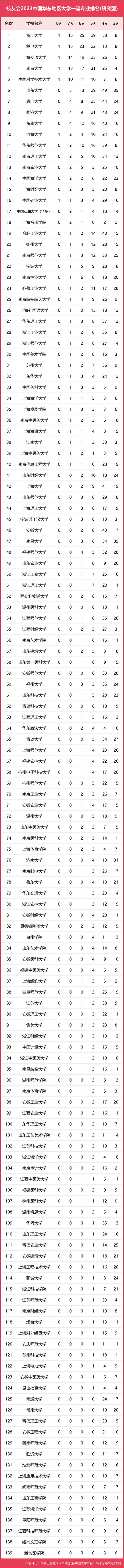 在最新校友會2023中國大學(xué)一流專業(yè)排名(研究型)中,浙江大學(xué)專業(yè)水平最高,有1個中國八星級專業(yè)(8★),15個中國七星級專業(yè)(7★),25個中國六星級專業(yè)(6★),29個中國五星級專業(yè)(5★),58個中國四星級專業(yè)(4★),奪得校友會2023中國華東地區(qū)大學(xué)一流專業(yè)排名(研究型)第一。復(fù)旦大學(xué)有1個中國八星級專業(yè)(8★),15個中國七星級專業(yè)(7★),23個中國六星級專業(yè)(6★),22個中國五星級專業(yè)(5★),13個中國四星級專業(yè)(4★),位列第2名。上海交通大學(xué)有1個中國八星級專業(yè)(8★),14個中國七星級專業(yè)(7★),19個中國六星級專業(yè)(6★),25個中國五星級專業(yè)(5★),26個中國四星級專業(yè)(4★),名列第3名。